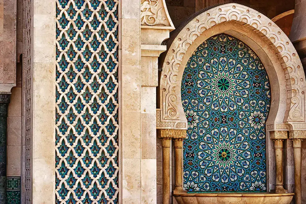 The pattern falls into the category of Islamic architecture. It has striking sculptural forms and dazzling ornamental details that characterize the mosque. This Islamic building reflects a divine beauty that is based on symmetry and momentum that is breath-taking for its observer and interconnects the lines shaped by growth, movement, and progress. It all manifests the unity of creation that symbolizes the unity of God.